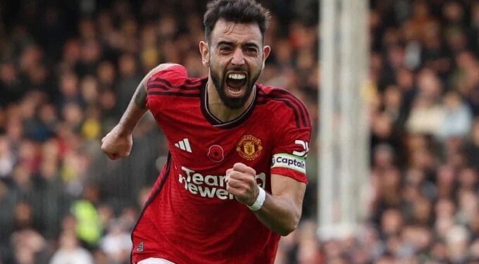 Bruno Fernandes celebrates after scoring a goal for Manchester United.